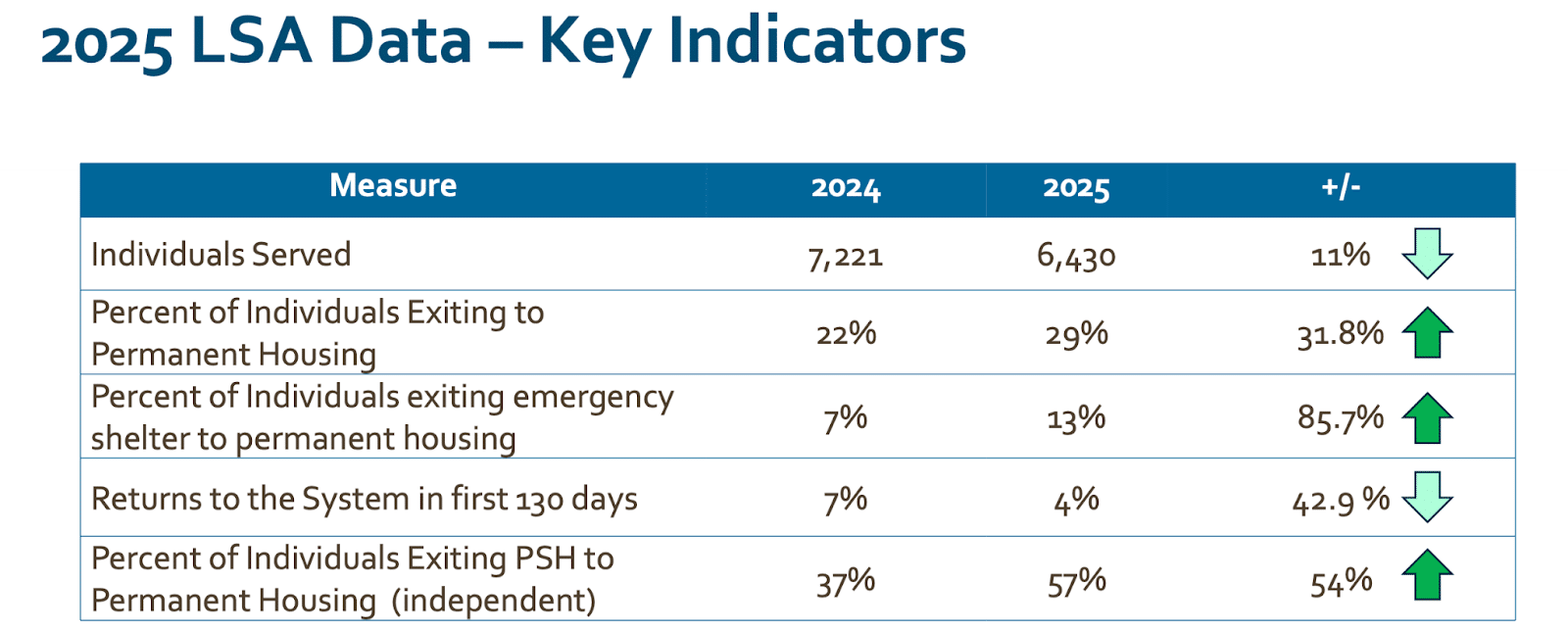 Included in the packet was preliminary data from the city’s 2025 Longitudinal Systems Analysis, a more accurate form of measuring homelessness in the city than the Point-in-Time Count. Initial results to be presented by Dawn Kinder indicate some positive momentum for the city.