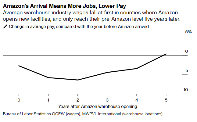 - When Amazon comes in, wages go down: “In 68 counties where Amazon has opened one of its largest facilities, average industry compensation slips by more than 6% during the facility’s first two years”