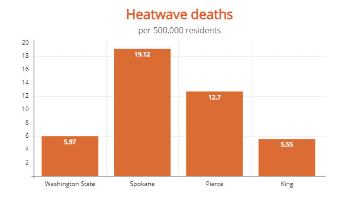 Last week the Department of Health reported that 78 people died of heat exposure in Washington during the recent heatwave. That number was later revised up to 91. Separately, the Spokesman Review reported that 20 Spokane County residents died of heat exposure in just the period between July 1 and the story’s publishing, on July 8.