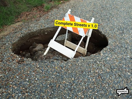 You can imagine my disappointment when the street was re-striped with precisely the exact design as it had pre-construction. Even today, it has five lanes of traffic next to houses, turn lanes to nowhere, no traffic calming to be seen, sidewalks directly next to fast traffic and no bike facilities – neither parallel to it nor on it. It feels anything but “Complete”, despite being resurfaced long after the passage of Complete Streets 1.0. The city’s dereliction of its duty to provide safe infrastructure via this project is what spurred me to become more seriously involved in transportation advocacy — a path that has since included writing for RANGE.