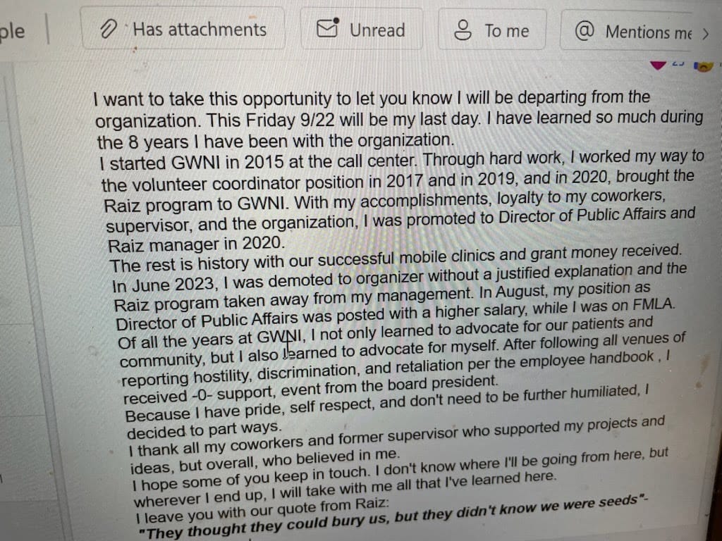 First, it was Sarah Dixit, who left after being told to take on a supervisor’s work with no additional pay. Next, the traveling Raiz clinics, which provided life-saving medical care to migrant farmworkers across the state, were quietly killed, and the employees in charge of them demoted. Two beloved clinicians were fired after speaking up about a discrepancy in pay between white and BIPOC clinicians. And, in the middle of 2023, current Spokane City Council Member Paul Dillon — then the Vice President of Public Affairs who employees said shielded them from toxicity in upper management — was demoted right before taking paternity leave. He was told it was because leadership had new concerns about him potentially holding public office while working in advocacy for the organization. His new role took him out of upper management and his pay was slashed.