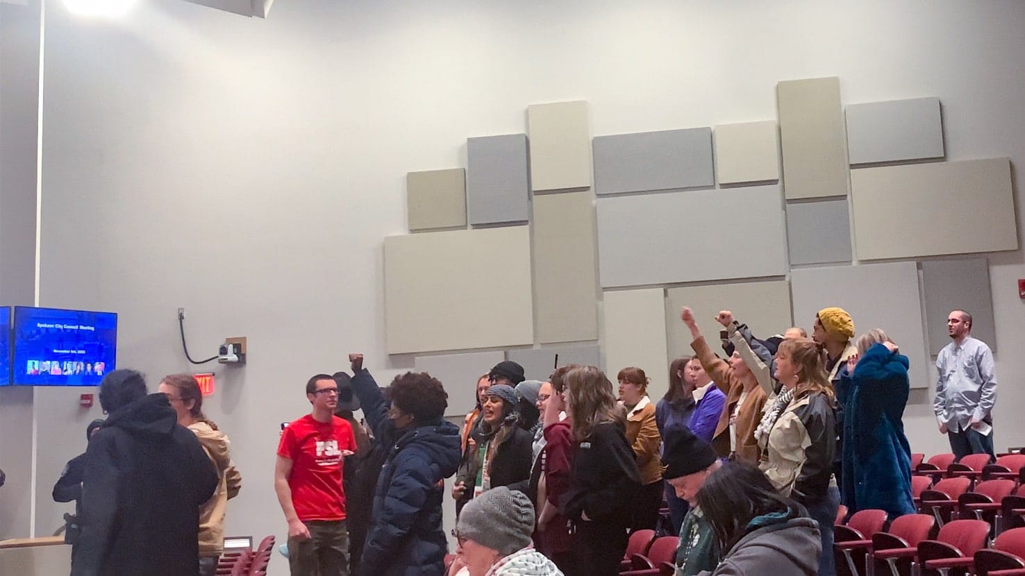 “City council, let us speak! Stop funding genocide. Let the people speak,” they chanted, as the crowd repeated their words back to them.