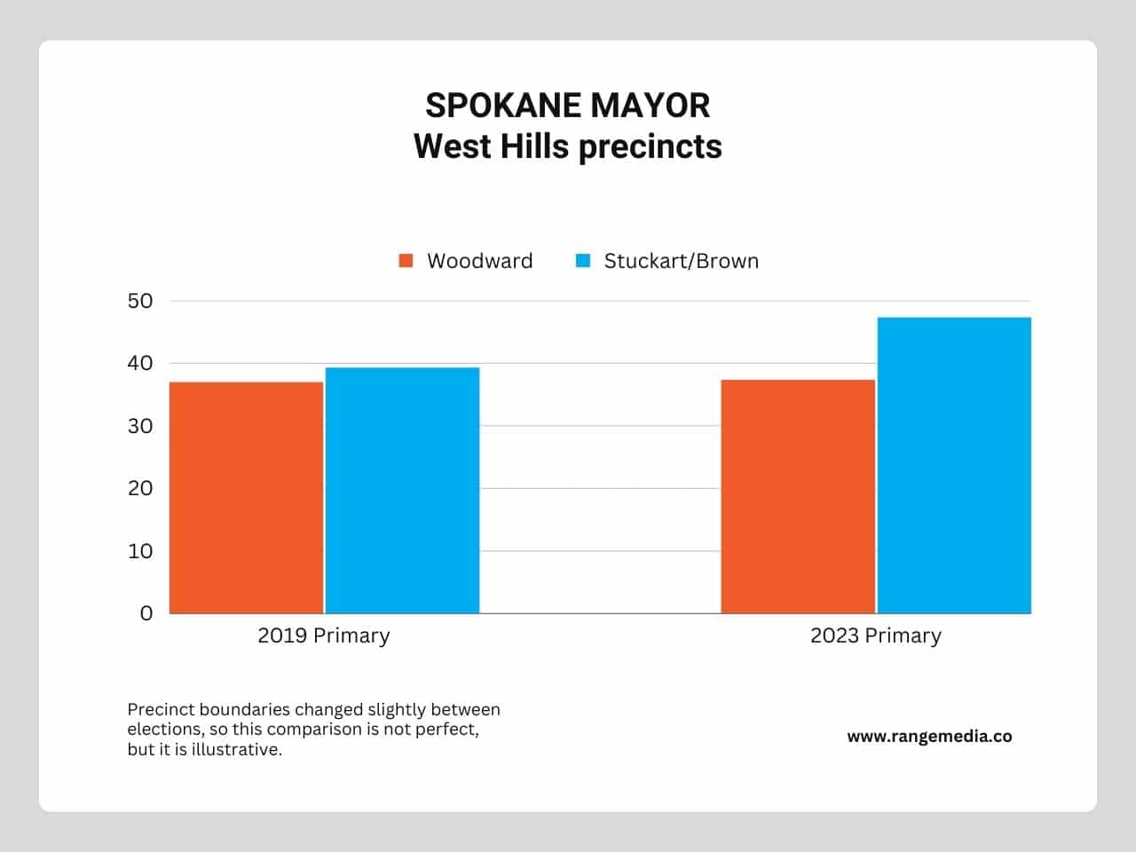 More importantly, Wilkerson outperformed Brown in all three city council districts, including doing 4% better than Brown in District 1, which roughly covers Spokane east of Division and north of Trent. District 1 is currently represented by two conservative council members — Michael Cathcart and Jonathan Bingle — it also elected Kate Burke, the most progressive councilperson in recent memory, so it’s a wildcard. It was also a spoiler, with several progressive election operatives saying a key part of Mayor Woodward’s razor-thin victory in 2019 was her challenger Ben Stuckart underperformance in the district.