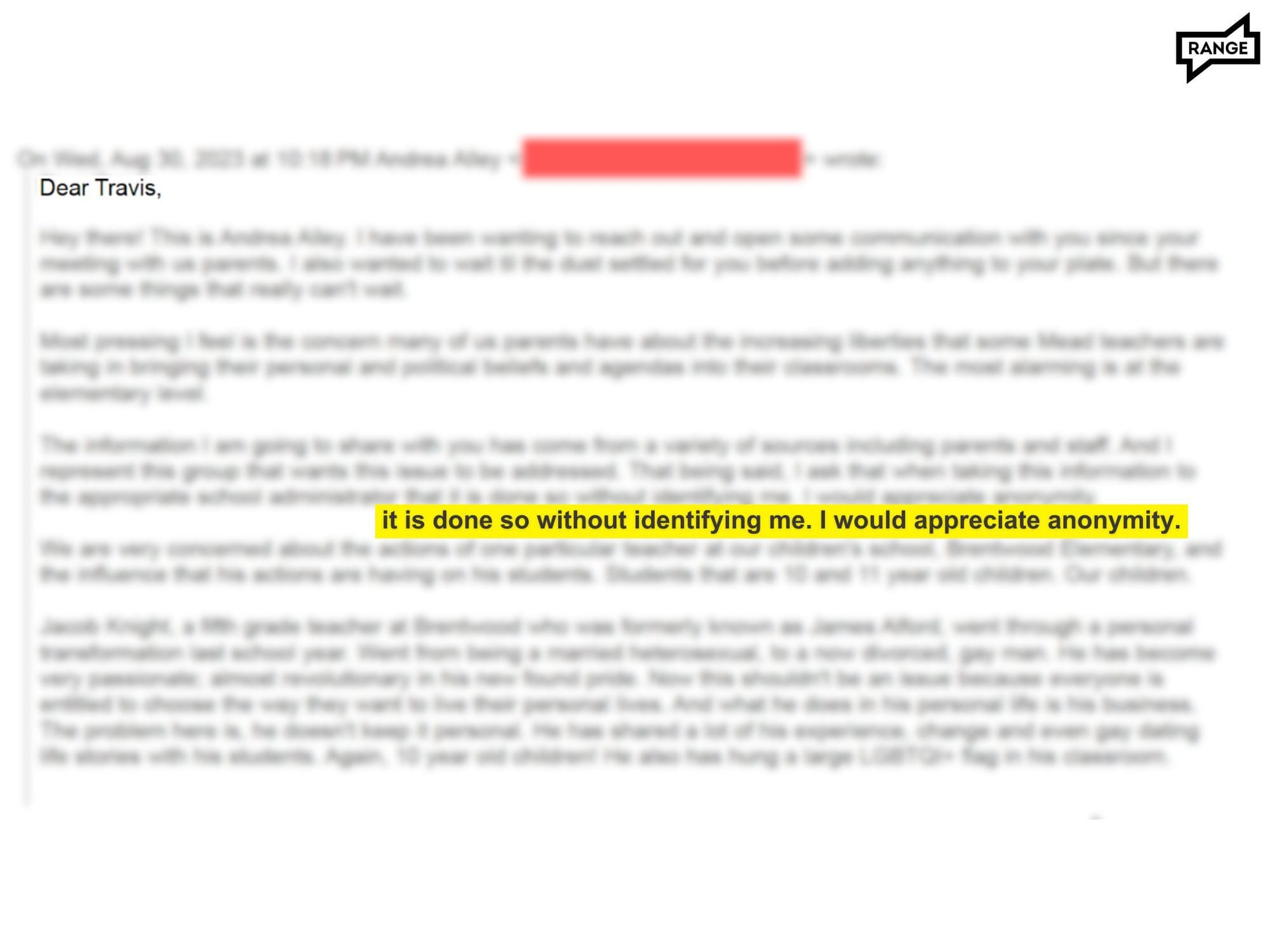 RANGE recently obtained multiple emails sent to staff at Mead School District (MSD), including from a parent who asked the superintendent for anonymity. That email came from parent Andrea Alley, who wanted her complaint to superintendent Travis Hansen about the presence of a Pride flag in Knight’s classroom — which she called “grooming and child abuse” — to remain anonymous. Regardless of the sender’s preferences, though, when Mead responded to the records request, it included this email with no redactions at all, even the sender’s email address (which RANGE is choosing to redact to maintain a modicum of privacy).