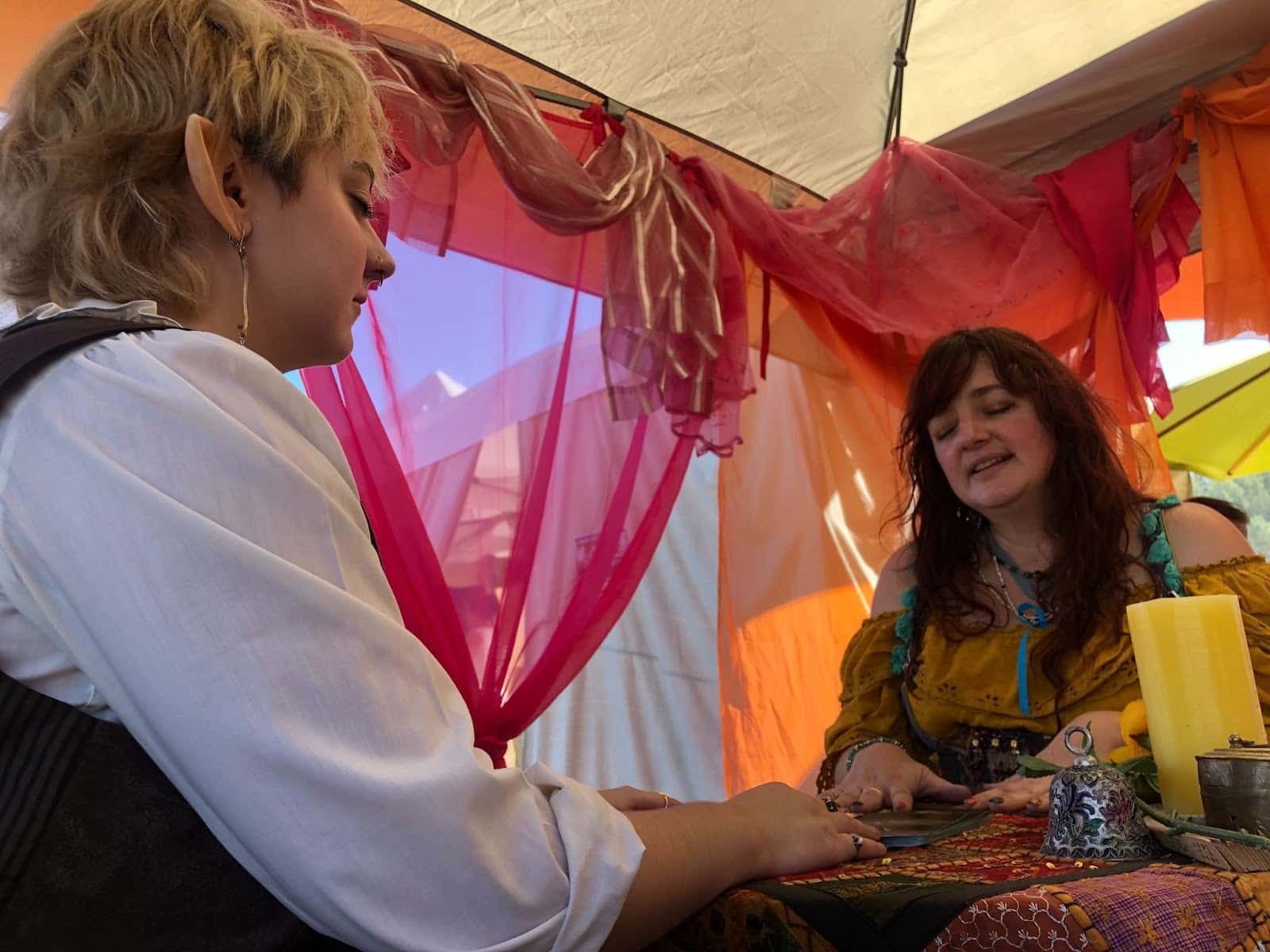 In a tent stretched with brightly-colored, gauzy fabrics and littered with floor pillows, I met a queer, polyamorous couple who ran the booth together: one of them does tarot readings, the other sketches portraits. The tarot reader, Theo, is a self-described “recovering fundamentalist” who is reconnecting with her own Celtic spirituality. Theo is a ren faire regular, traveling what she called the ren faire circuit, which treks through the western states, but her partner, Aoife is newer to the scene having just returned to the states after teaching in Taiwan. Many of the other vendors at the Spokane faire do the same, which means they all know each other by name.