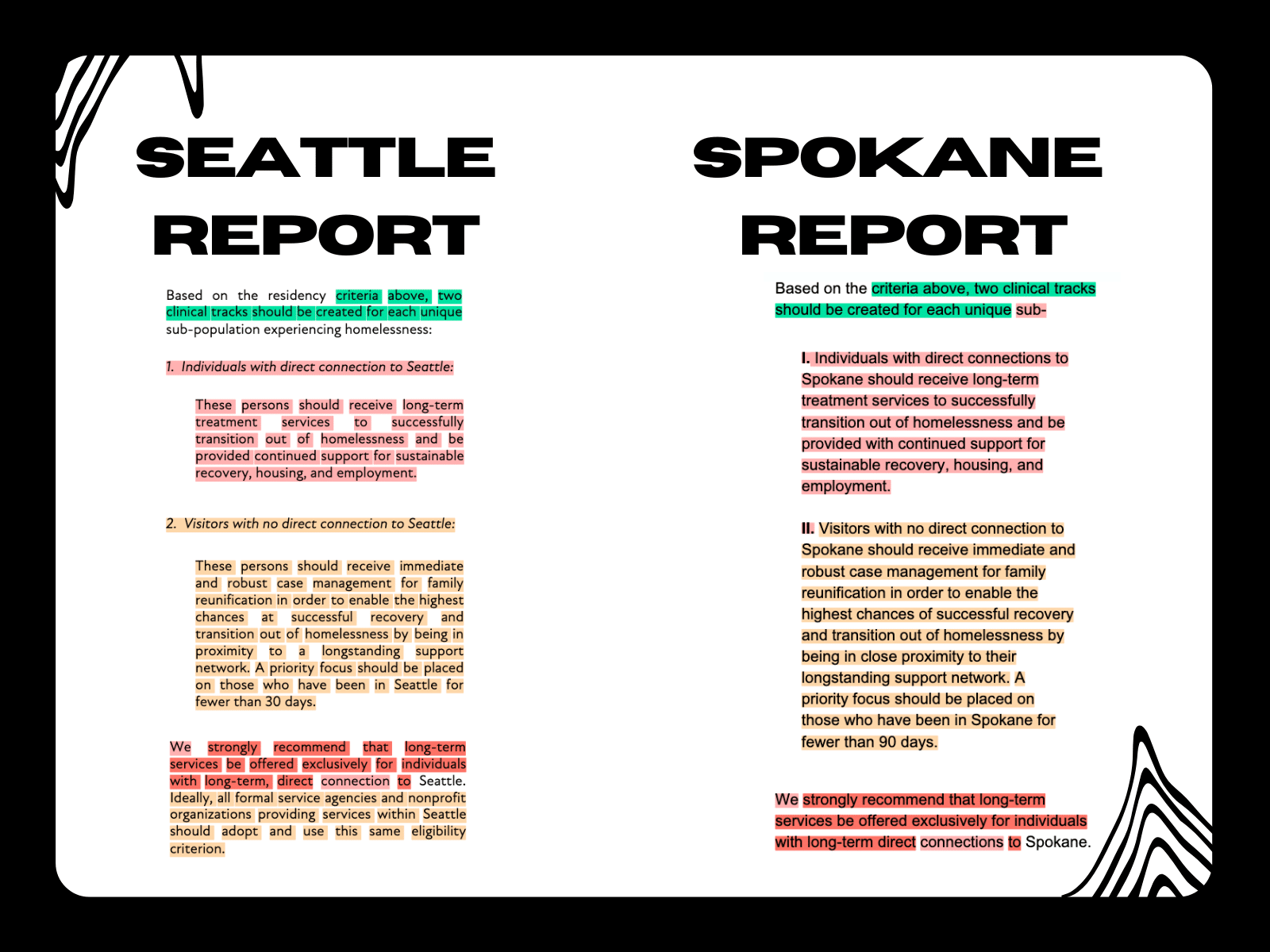 - One for: “Visitors with no direct connection to Spokane should receive immediate and robust case management for family reunification in order to enable the highest chances of successful recovery and transition out of homelessness by being in close proximity to their longstanding support network. A priority focus should be placed on those who have been in Spokane for fewer than 90 days.”