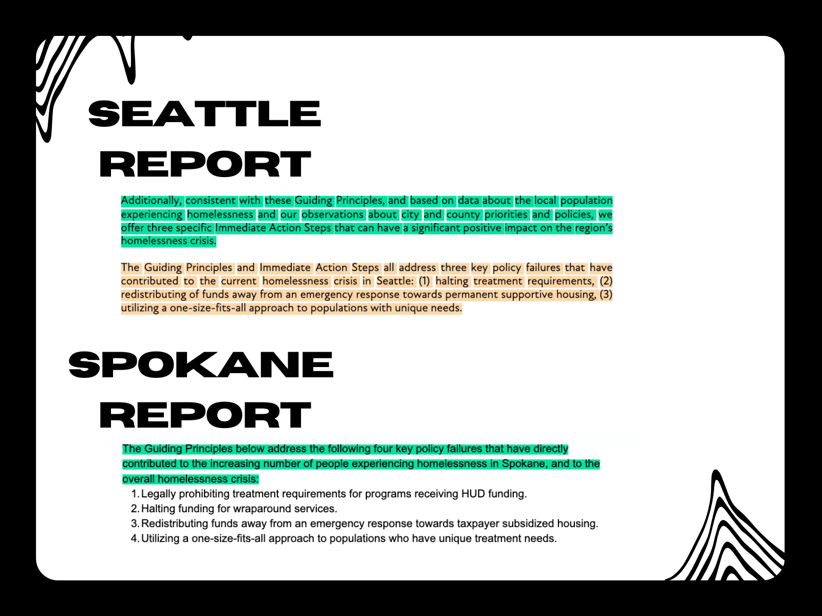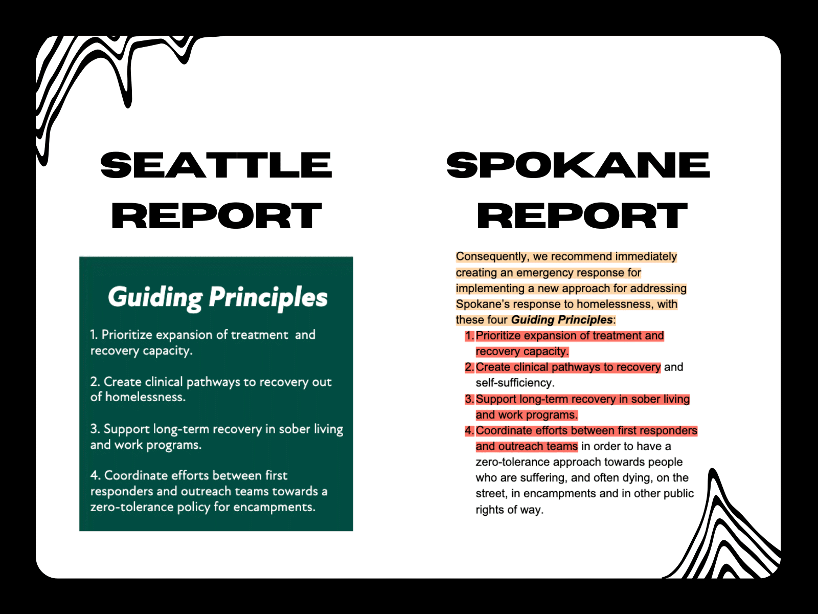 - “The prevailing policies aimed at addressing homelessness in Spokane have discontinued funding treatment for substance use disorders, removed treatment requirements, redistributed funds away from an emergency response system to long-term taxpayer subsidized housing, and utilized a one-size-fits-all approach to populations with varying needs.”