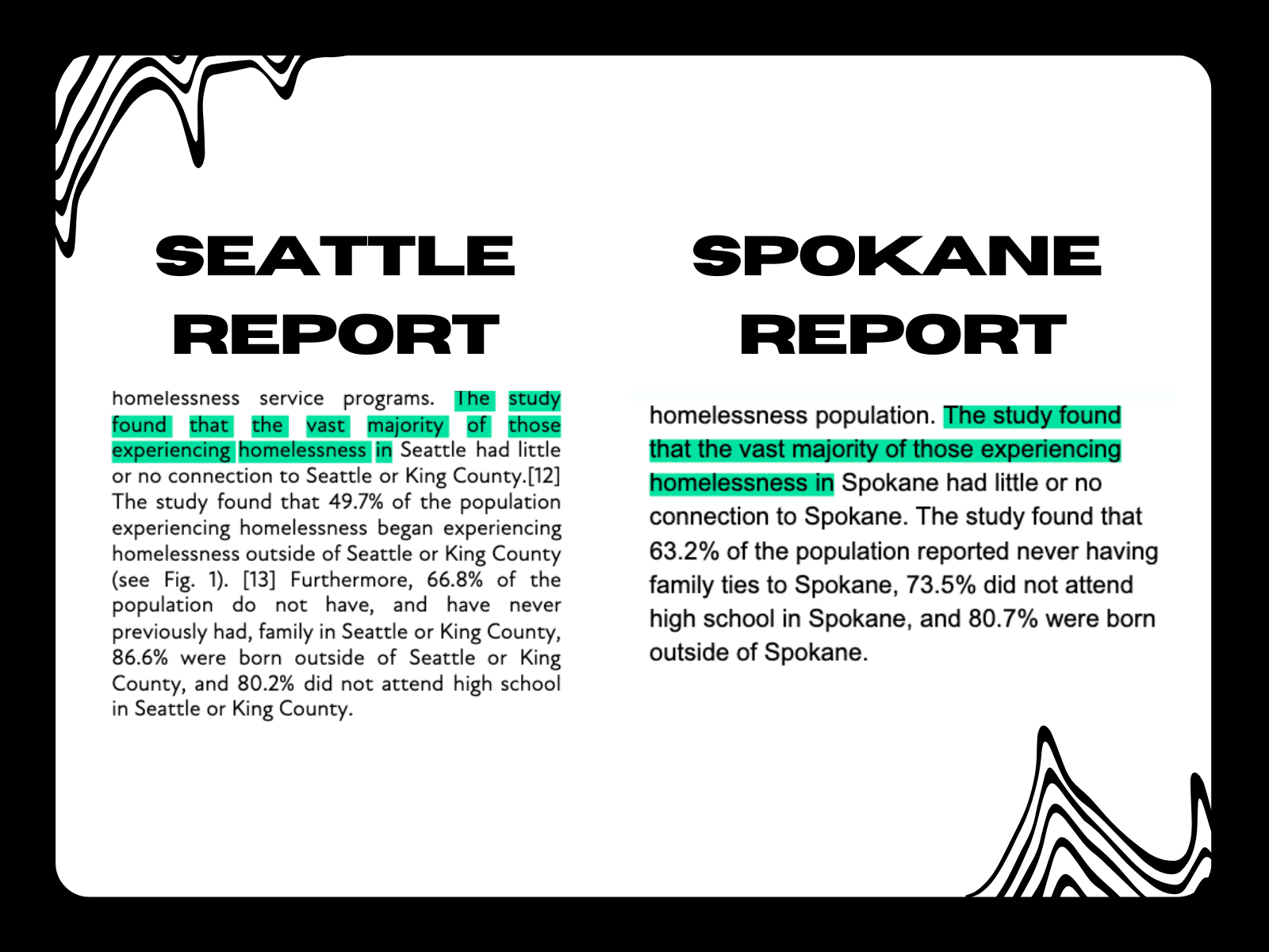 Consider the central finding of the Marbut study: 50.2% of people surveyed first experienced homelessness elsewhere, which the study authors claim “highlights that Spokane is often a secondary destination after individuals start experiencing homelessness.”