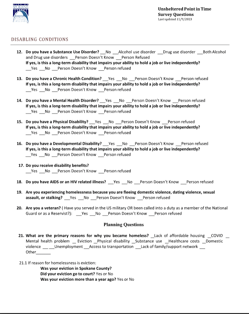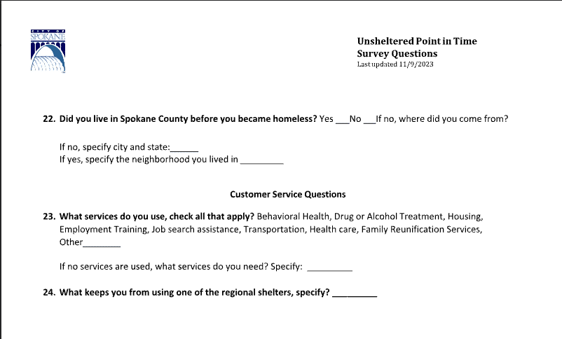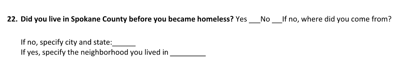 The PIT count question asks more simply: “Did you live in Spokane County before you became homeless?”