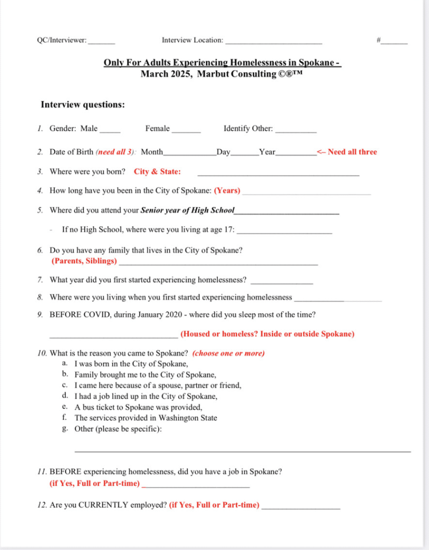 The Marbut-designed study asks for high school attendance, where someone lived when they first experienced homelessness, when they first experienced homelessness and why they came to Spokane, as well as whether or not someone has a parent or sibling living in the city.