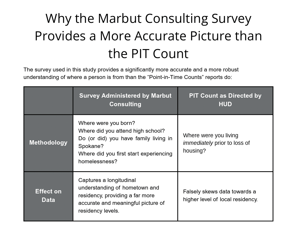 When analyzing the accuracy of a survey, it’s important to consider the source. In the case of this survey, there are a few sources: Spokane Business Association, who paid to have it conducted, Marbut, who created the survey and prepared the report and a third source: Marbut’s earlier report on homelessness in King County that has nearly identical language to this Spokane survey.