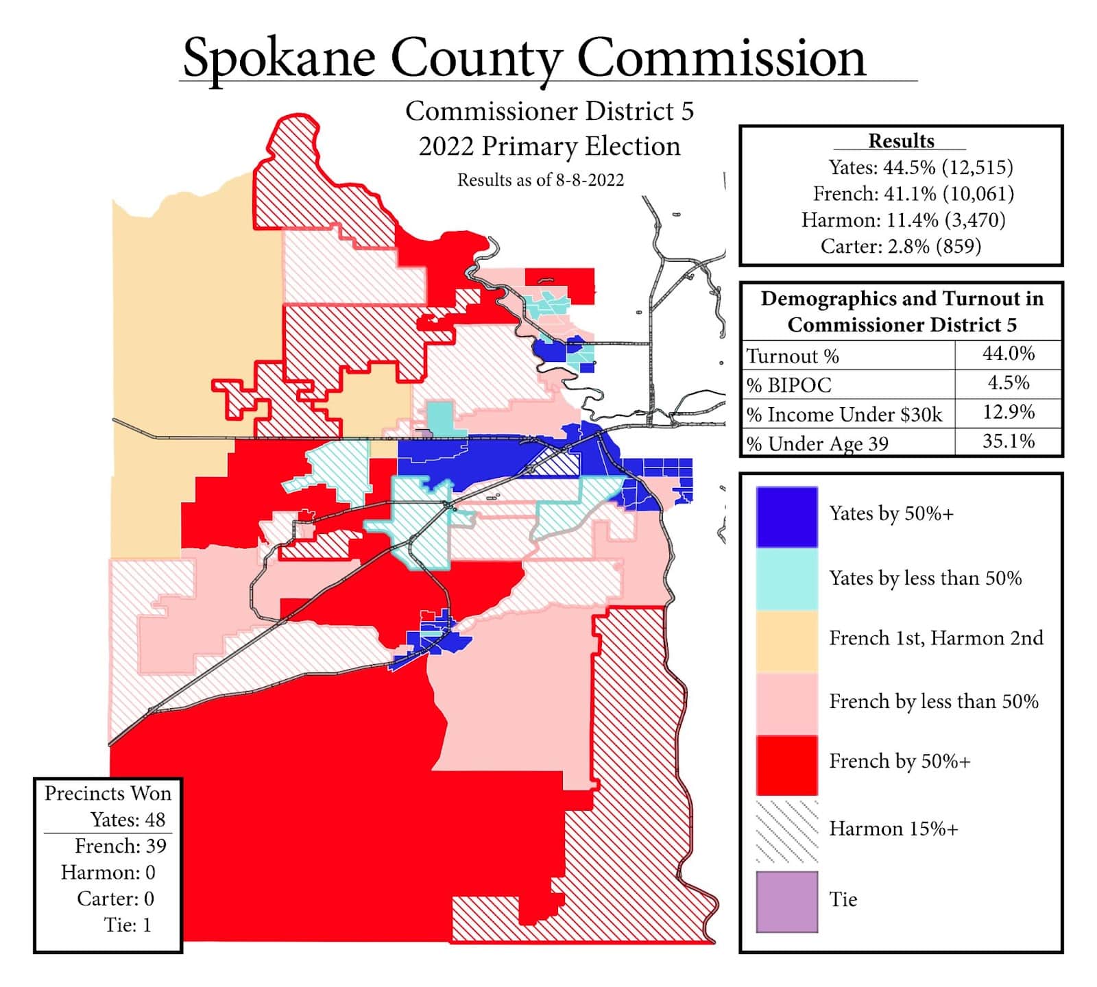 But how many Harmon voters would Yates need to gain in order to defeat French? It is hard to say, since the primary can have a different voter composition than the general election. But, if we assume that the voters will be the same, Yates would need to win about 35.5% of Harmon voters. Yates could benefit from engaging Carter voters too, particularly in Cheney and Airway Heights where Carter earned 7-8% of the vote in some precincts.