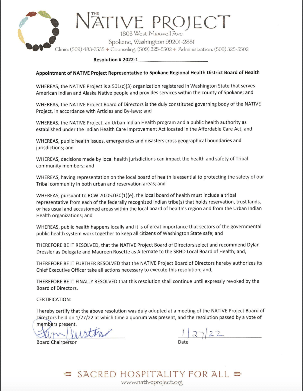 When Lowe sent the resolution from The NATIVE Project naming Dressler as a delegate, the email stated, “I have the first letter of appointment to your local board of health from the 501c3 that is serving Native Americans, which is the NATIVE Project.”
