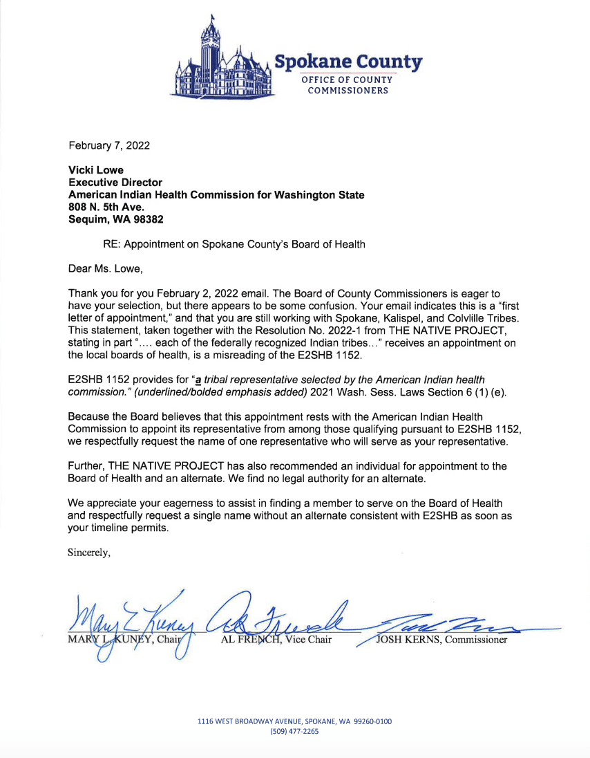 “Although other local boards of health have read this and added a set for Tribal representation for each federally recognized Tribe and 502(c)(3) (or Urban Indian Health Organizations); Spokane Regional Health District chose to interpret this from a lack of understanding of what Tribal representation is. One Tribal Nation cannot represent another Tribal Nation, they may only represent themself.