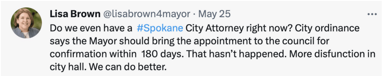 - Is Spokane without an official police chief? According to old Lisa Brown tweets, the answer is yes, as interim chief Justin Lundgren has overstayed his 180 day contract. Brown’s administration is seeking to remedy that in the PIES Committee.