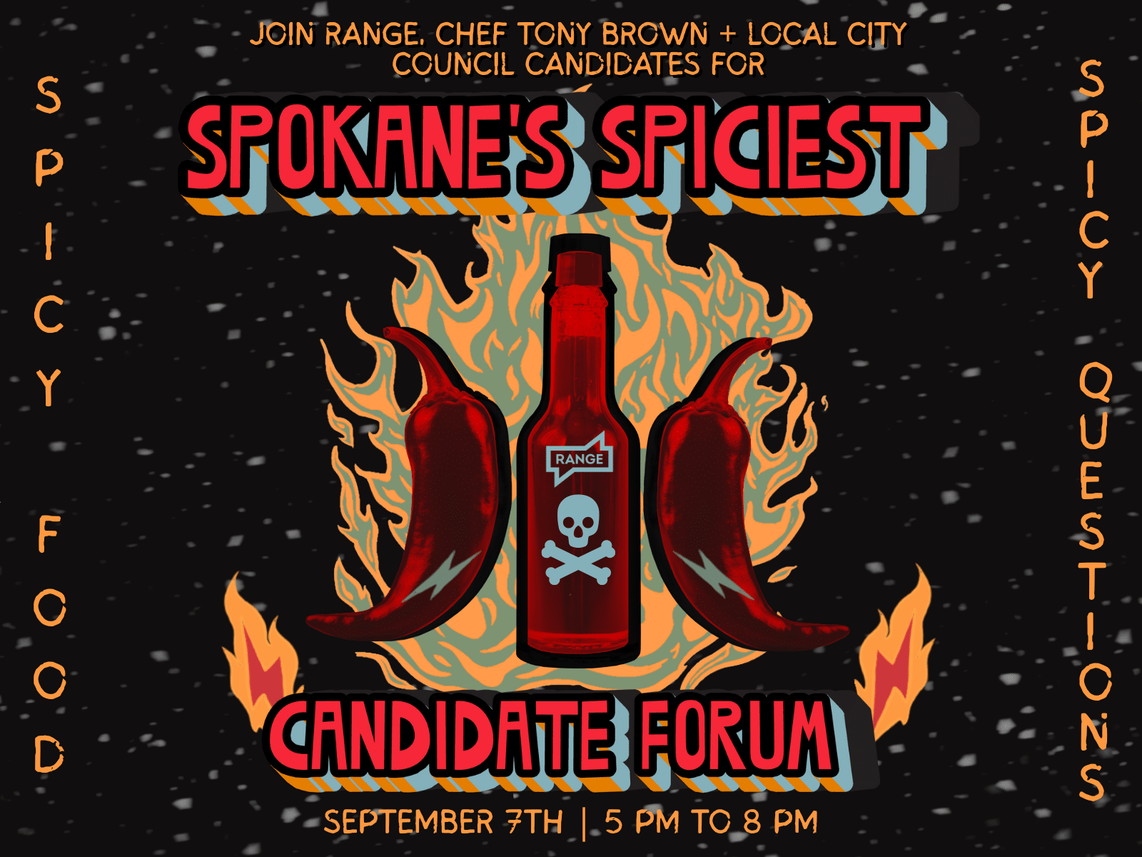 Join us on Sunday, September 7 from 5 to 8:30 pm for Spokane’s Spiciest Candidate Forum, where candidates running for Spokane City Council races will join RANGE reporter Erin Sellers onstage at The Guardian to answer increasingly spicy questions while eating increasingly spicy food cooked by Chef Tony Brown - the mind behind Ruins and some of Spokane’s best restaurants of the last 15 years.