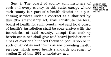 TLDR, 53 years ago the legislature said, “hey county commissioners, form health boards and stuff.” It also sounds like a city over 100,000 can opt to do their own thing? Not sure if that is still on the books (the public health laws have been amended at least once since then, in 1993).
