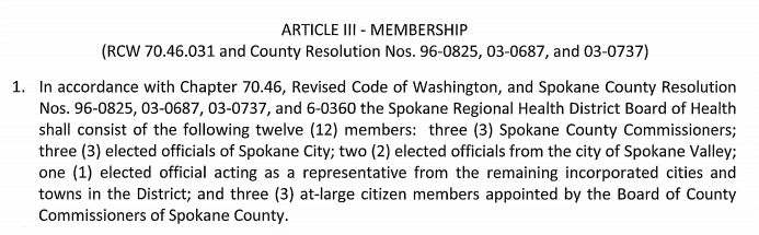 The Spokane Regional Health District’s bylaws were last updated in 2018 and further spell out how the Spokane Commissioners decided to compose their board: