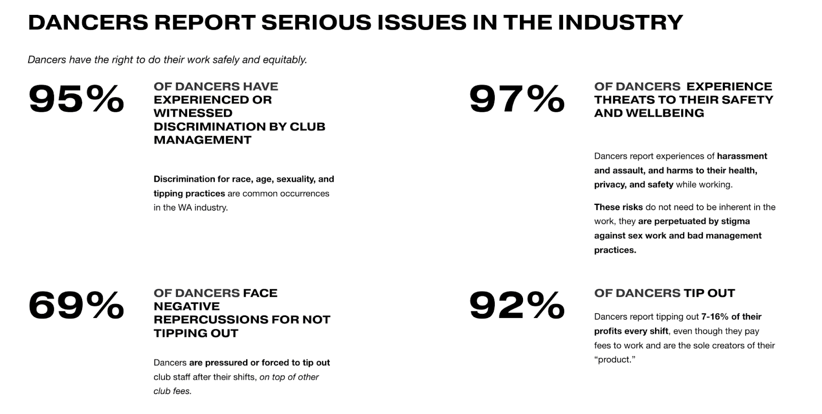 RANGE heard similar sentiments from multiple dancers. They didn't feel safe or protected by the legal system and faced stigma whenever they tried to report violence against them.