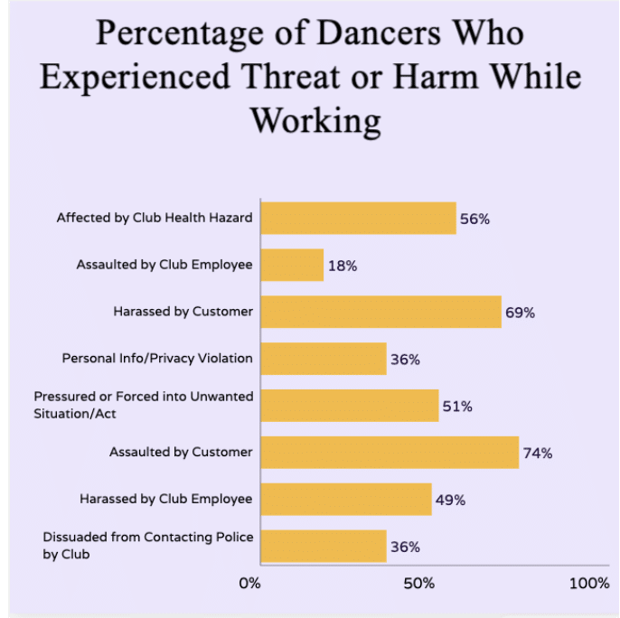 Statistics from a survey put out by SAW show 74% of Washington dancers have been assaulted by a customer, and 36% of them dissuaded from contacting police by the club they danced at.