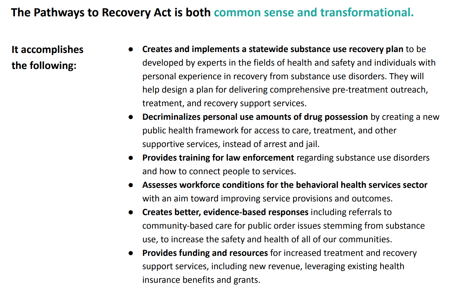 There’s another bill — HB 1499, The Pathways to Recovery Act — that would have a massive ongoing impact, creating a coordinated, uniform state-wide response to substance abuse and addiction, looking to better the treatment services system across the board and giving police training on how to respond to people with substance abuse disorders.