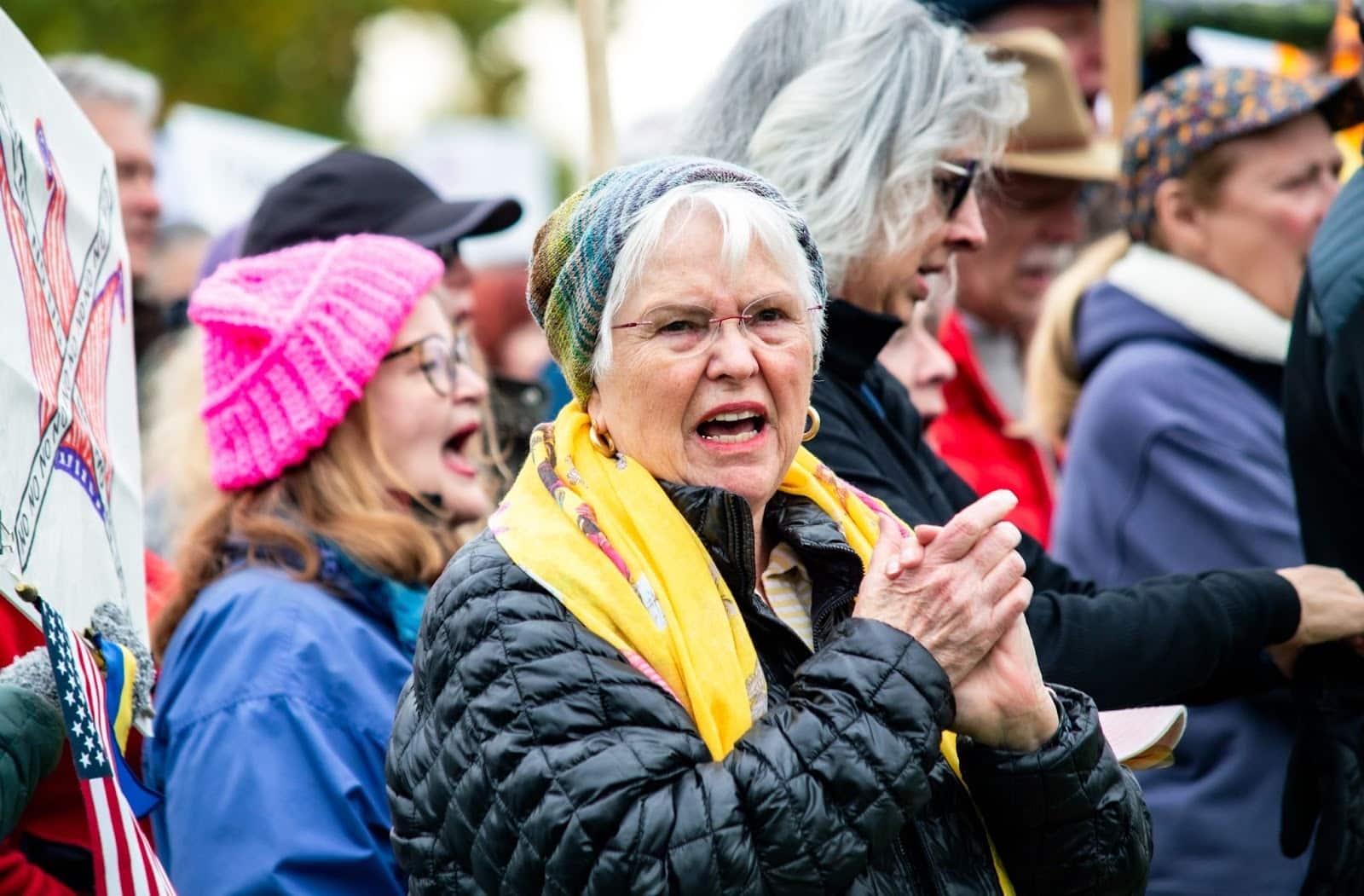 Attendees wear coats, gloves, and scarves while listening to speeches by The League of Women Voters. Photo by Sandra Rivera.