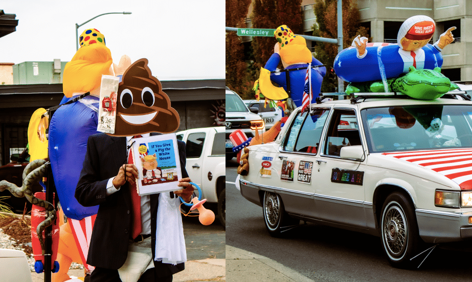 Dennis Mitchell rolled up to the protest in a car decorated with inflatable Trump dolls, stickers and a poop emoji crown. “Today is way bigger, way better” than the April Hands Off! protest, he said.