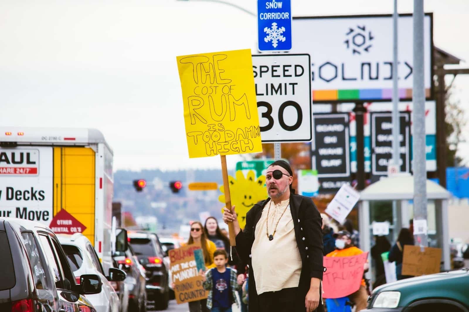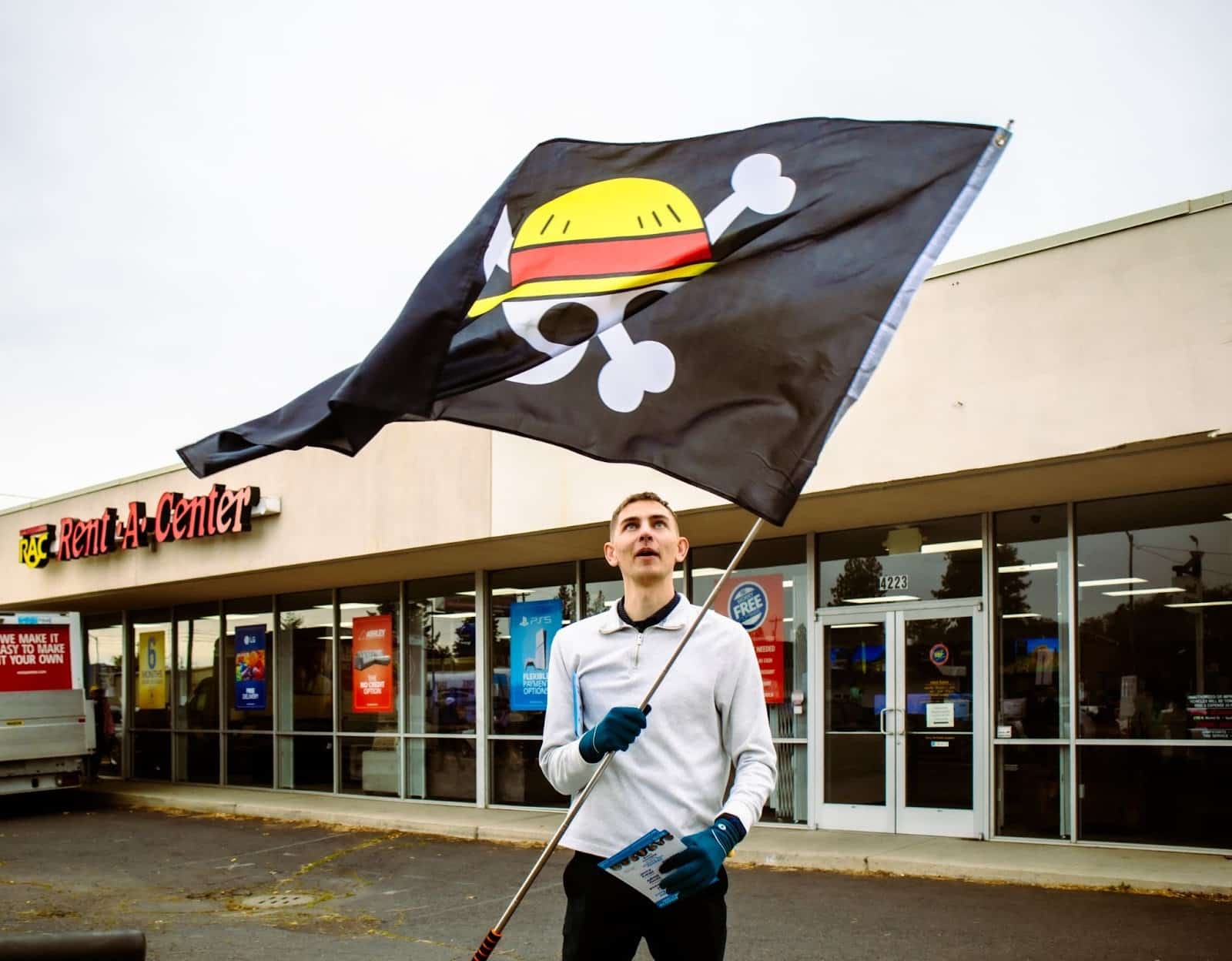 The pirate flag from the anime, One Piece, has become a symbol during protests. Photo by Sandra Rivera.