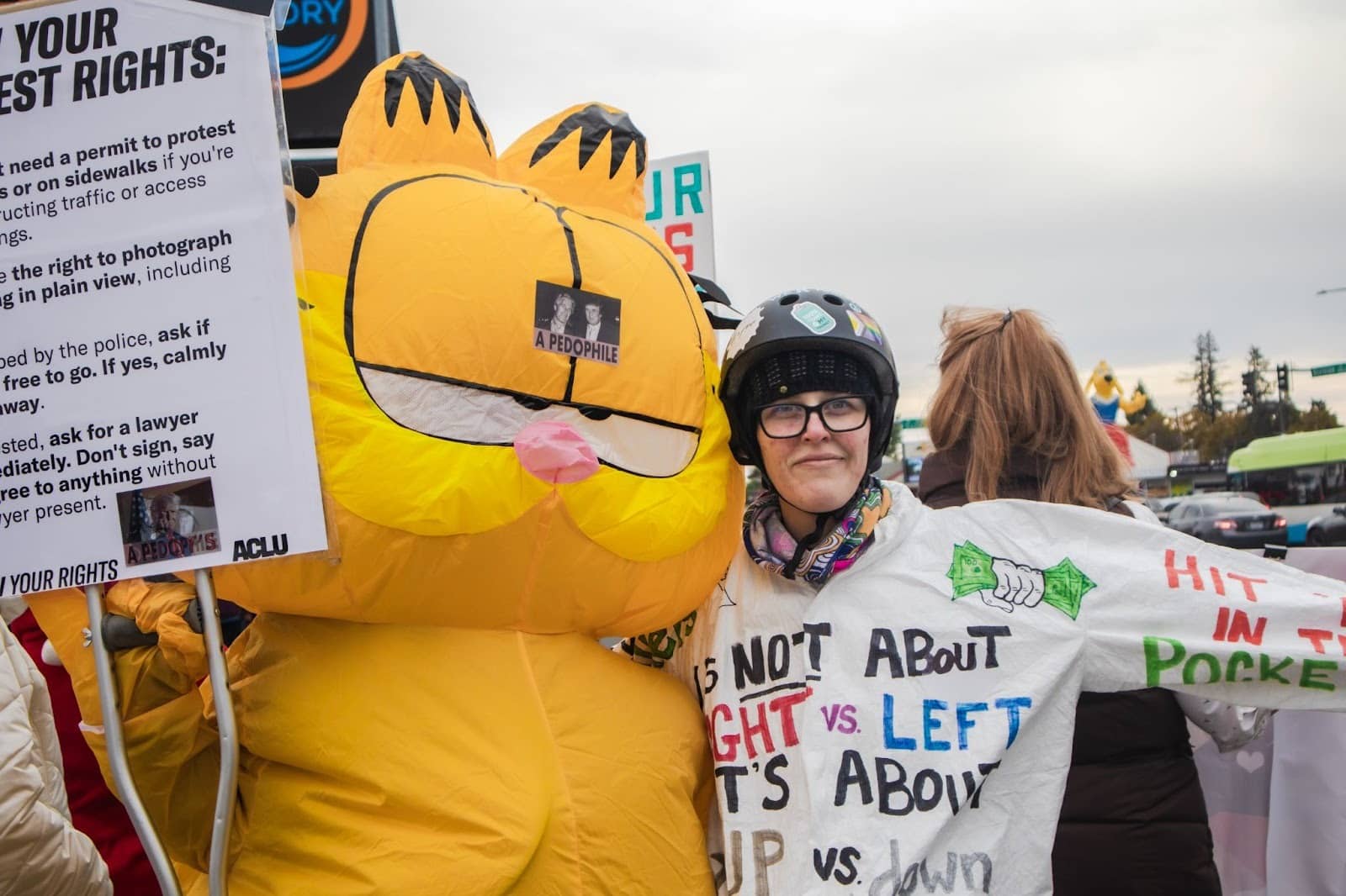 A protester wearing an inflatable frog costume holds a sign depicting Trump’s pants on fire. Photo by Sandra Rivera.