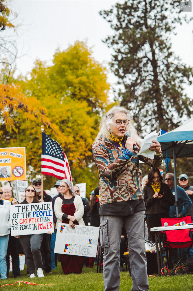 Maeve Griffith speaks before a crowd of thousands at the No Kings protest. (Photo by Sandra Rivera.)
