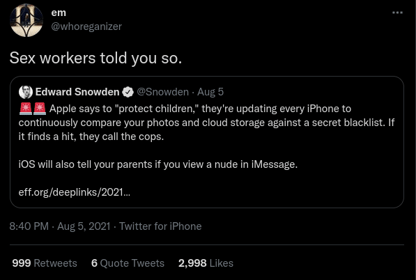 There’s also the matter of providing a backdoor to encrypted information. Apple is assuring us that user privacy won’t be compromised, but privacy advocates — and even Apple itself! — have said there is no way to create a backdoor to encryption that can only be used by the “proper authorities.”