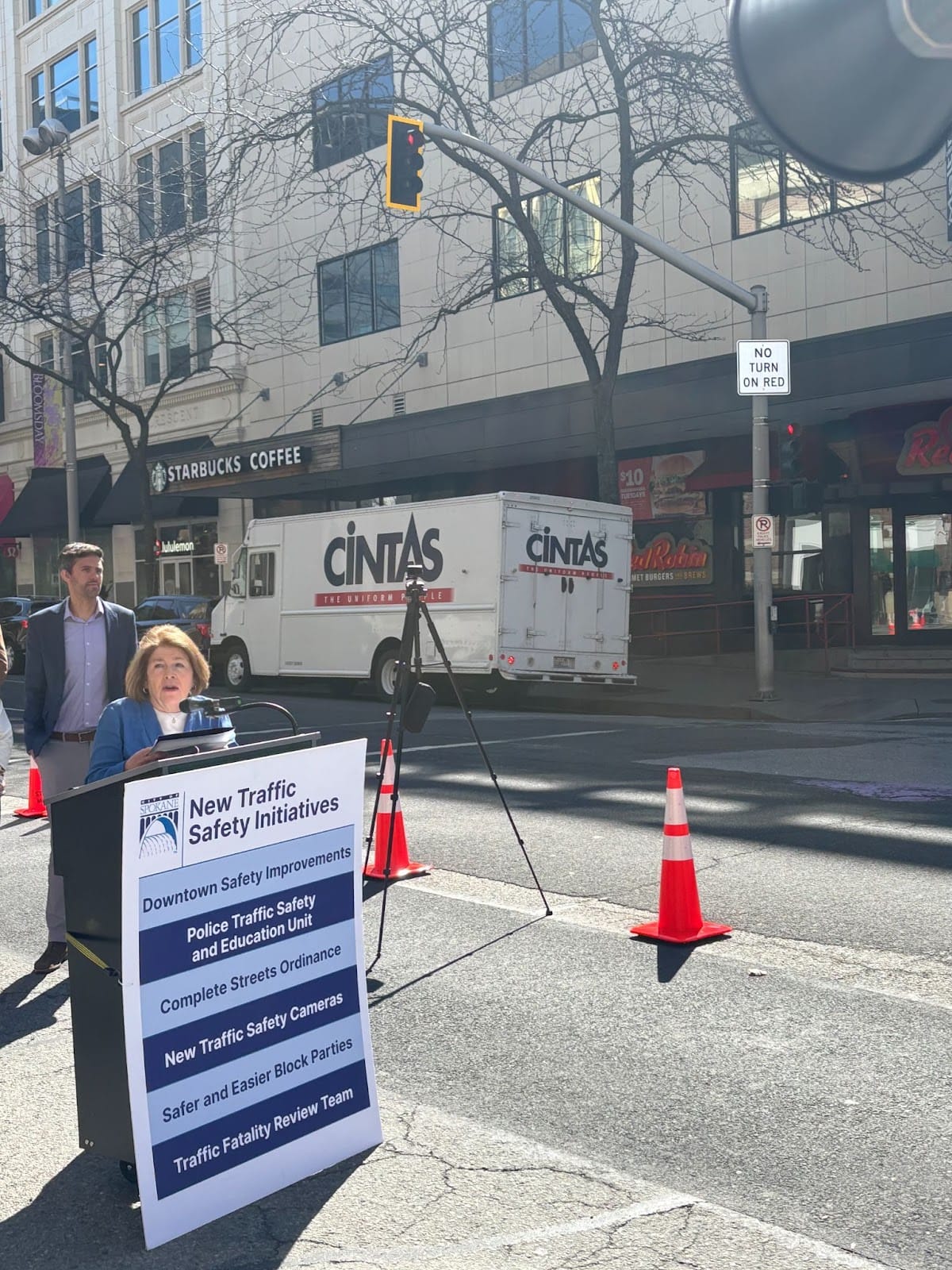 Notably, the press conference took place just six blocks west of where community advocate Janet Mann was killed by a driver who turned against a red light.