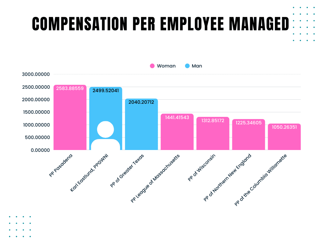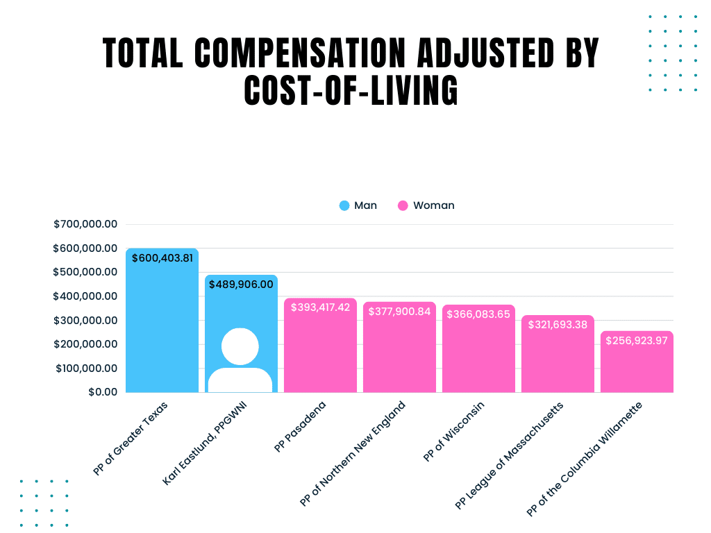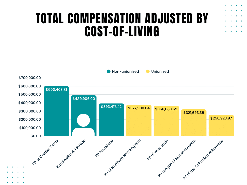- When you adjust the CEOs’ compensation by cost-of-living, Eastlund makes more than every other CEO of comparable affiliates, except one: Lambrecht. Lambrecht successfully shut down employee unionization efforts at his affiliate in 2021. Additionally, Lambrecht’s pay is so high it’s been specifically noted in a 2023 report from anti-abortion advocacy group American Life League’s STOPP International, weaponizing the discrepancy in pay between Planned Parenthood’s male and female CEOs as part of their campaign against reproductive rights.