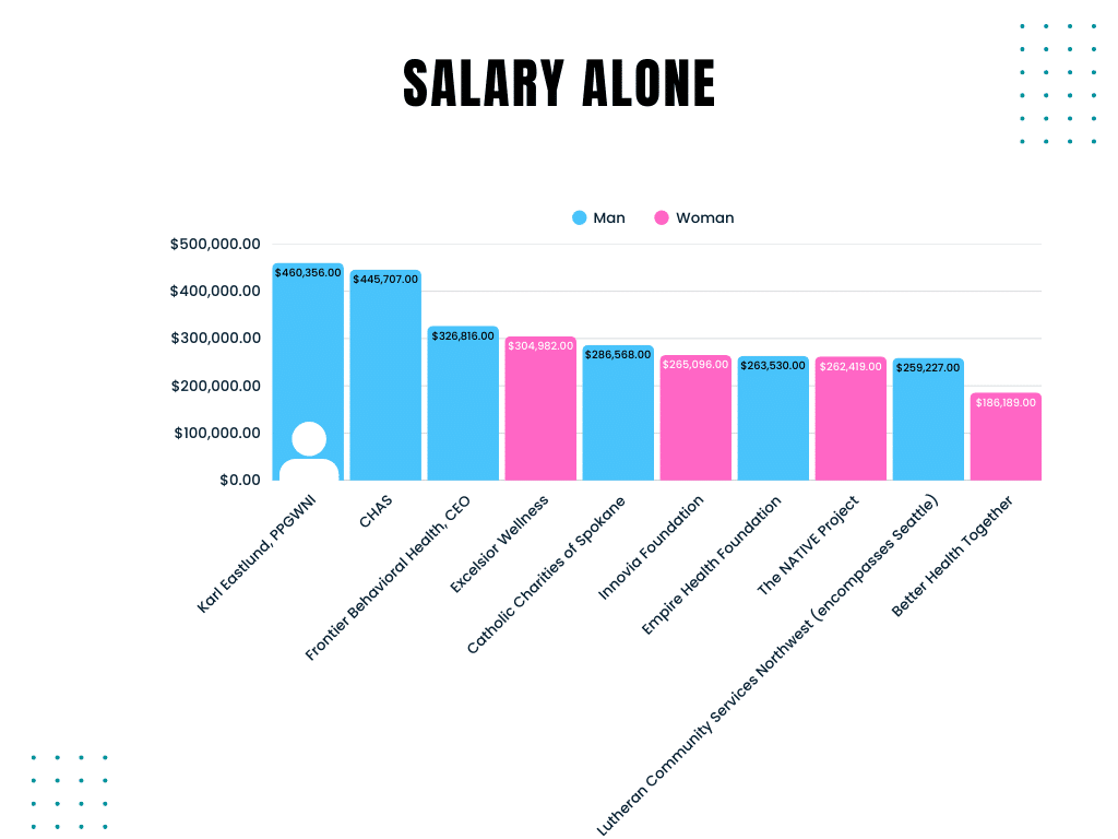 To get a sense of whether Eastlund’s compensation was in line with other similar leaders, we compared his compensation with executive compensation data for comparable local nonprofit healthcare organizations and foundations, as well as Planned Parenthood affiliates across the US that have similar levels of yearly revenue to PPGWNI.