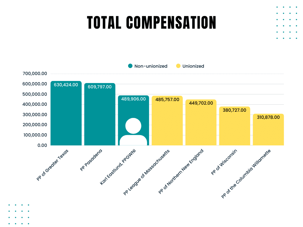 - CEOs of non-unionized Planned Parenthood affiliates — like PPGWNI — generally make more than CEOs of their unionized peers. Eastlund’s compensation follows that trend; his total compensation is higher than the CEOs of all other unionized affiliates with comparable annual yearly revenue.