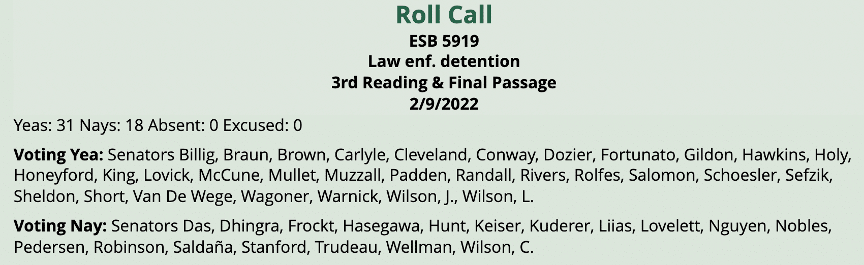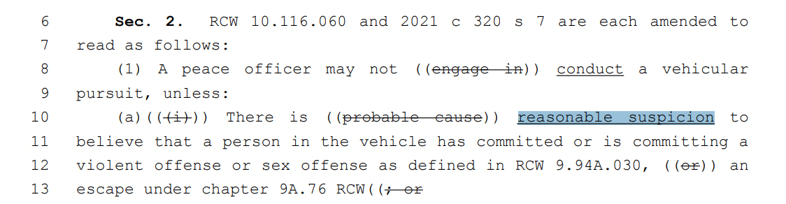Senate Bill 5919 more clearly delineates the force that is allowable during short investigative stops (known as Terry stops) and lowers the legal threshold for traffic pursuits from “probable cause” to “reasonable suspicion.”