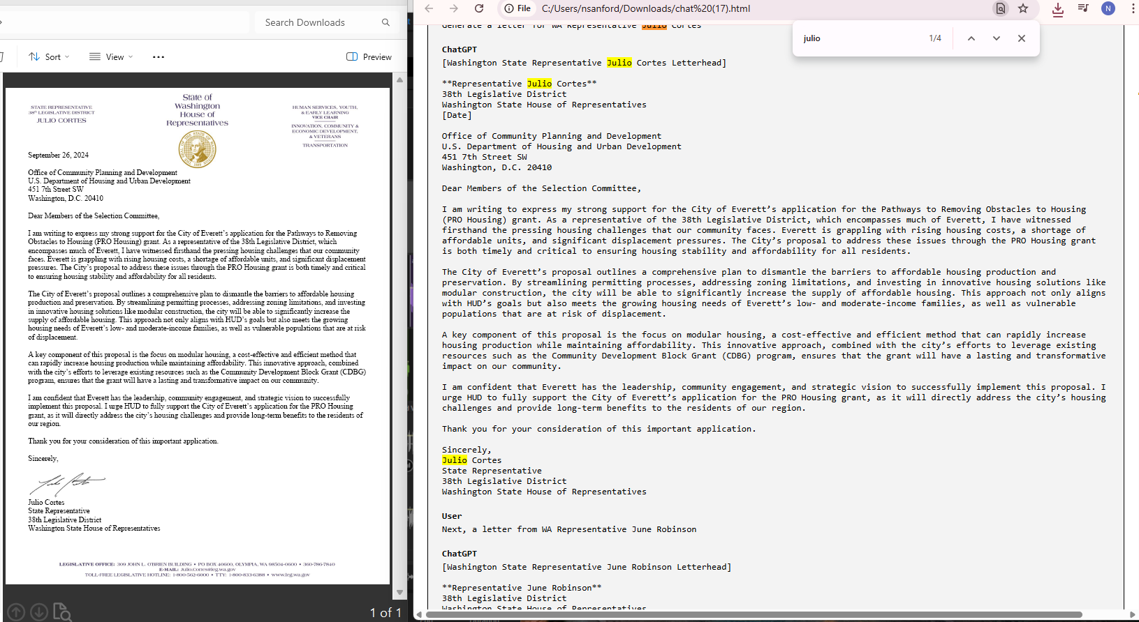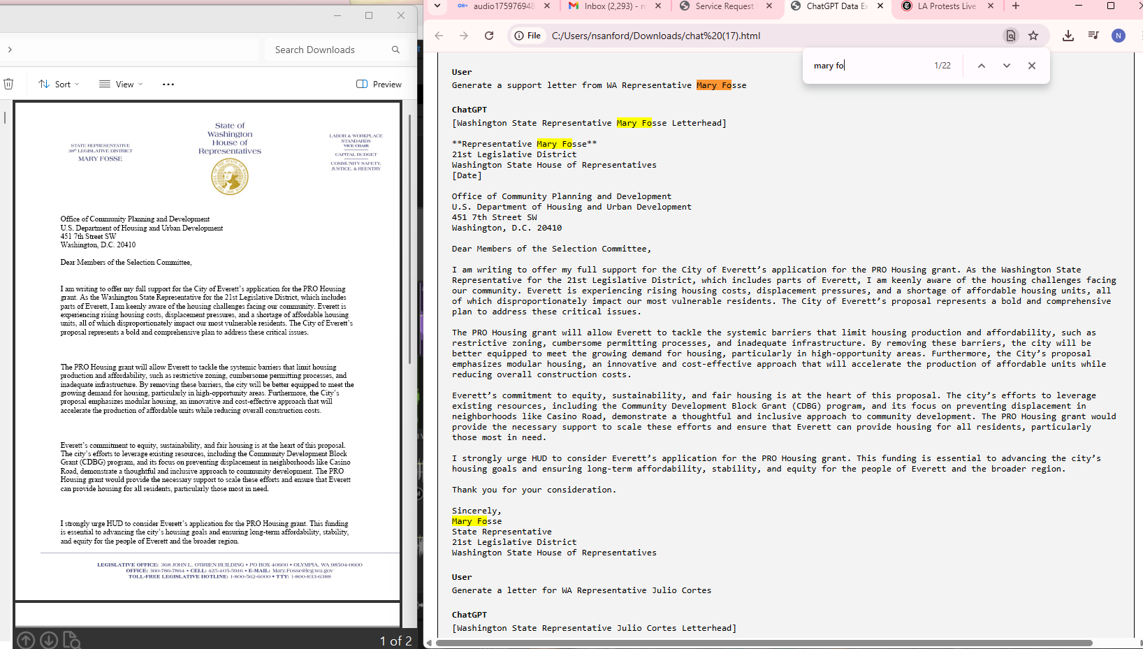 The staffer also used ChatGPT to generate more than 20 individualized letters of support from local elected leaders and organizations, including the Everett Housing Authority, the Snohomish County Treasurer’s Office, U.S. Senators Patty Murray and Maria Cantwell and several state representatives. The staffer also asked ChatGPT to generate an email template to send to those entities, asking if they’d be comfortable signing the support letter.