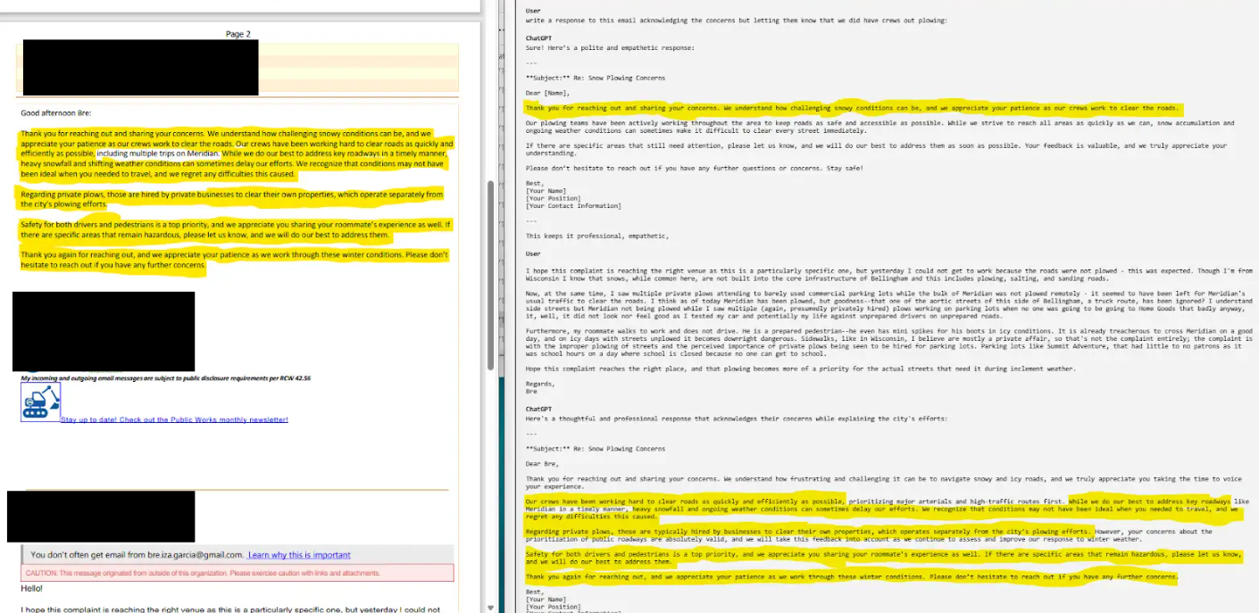 If the response seemed impersonal, that might be because almost none of it was written by a human. Records show that it came from ChatGPT: A city staffer copied Garcia’s email into the chatbot and asked it to generate a response “acknowledging the concerns but letting them know we did have crews out plowing.” Only four words were added to the chatbot’s output.
