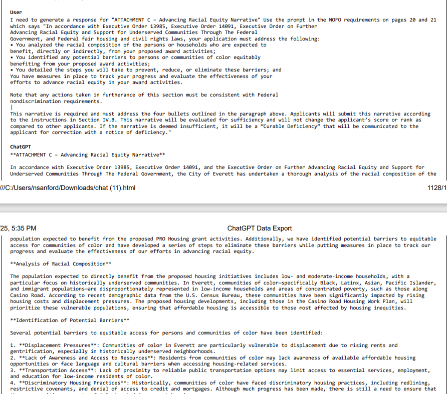 Similarly, a staffer in Everett used ChatGPT to fill out an application for $7 million in affordable-housing funding from the U.S. Department of Housing and Urban Development. The employee uploaded several city documents about the project, and told ChatGPT to use the information to generate answers to some of the application questions, a racial equity narrative and other large sections of the document.