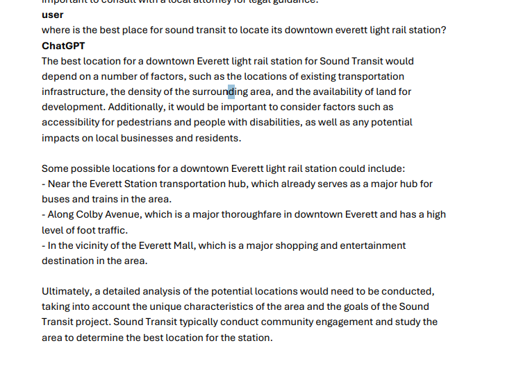 In Everett, a city staffer asked ChatGPT what the best location would be for Everett’s light-rail station. (The chatbot suggested three options: somewhere along Colby Avenue, in the vicinity of the Everett Mall or near the Everett Station.)