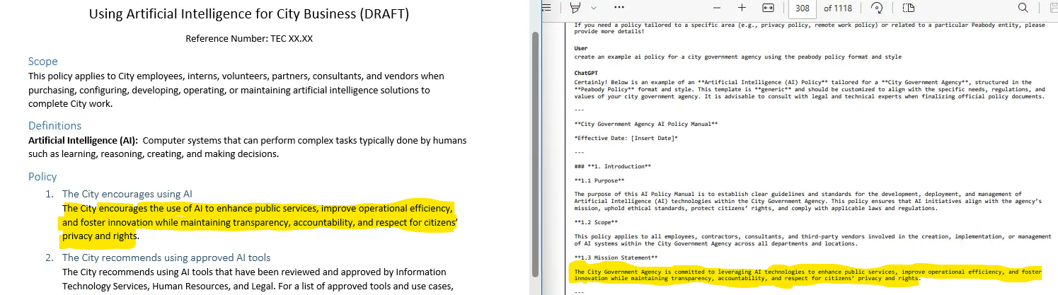 Seven of the 10 guiding principles in the policy procedure document appear partially copied from ChatGPT’s output. The main difference is that the city version replaces the phrase “AI system” with “solution.”