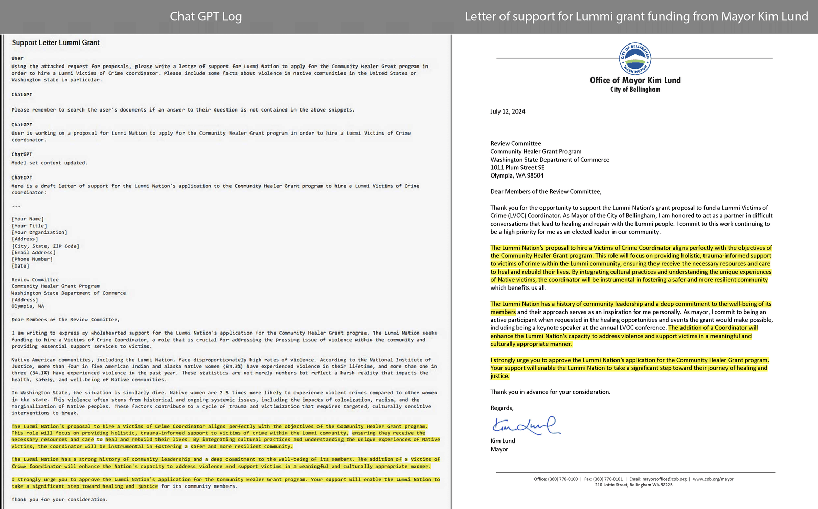 A letter of support for grant funding for the Lummi Nation, sent by Bellingham Mayor Kim Lund, that was written in part by ChatGPT.