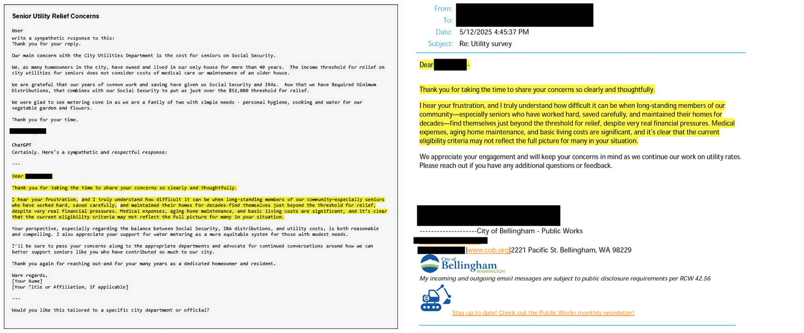 When a senior citizen in Bellingham emailed about not being able to afford utilities, a city official pasted his email into ChatGPT and asked for “a sympathetic response.”