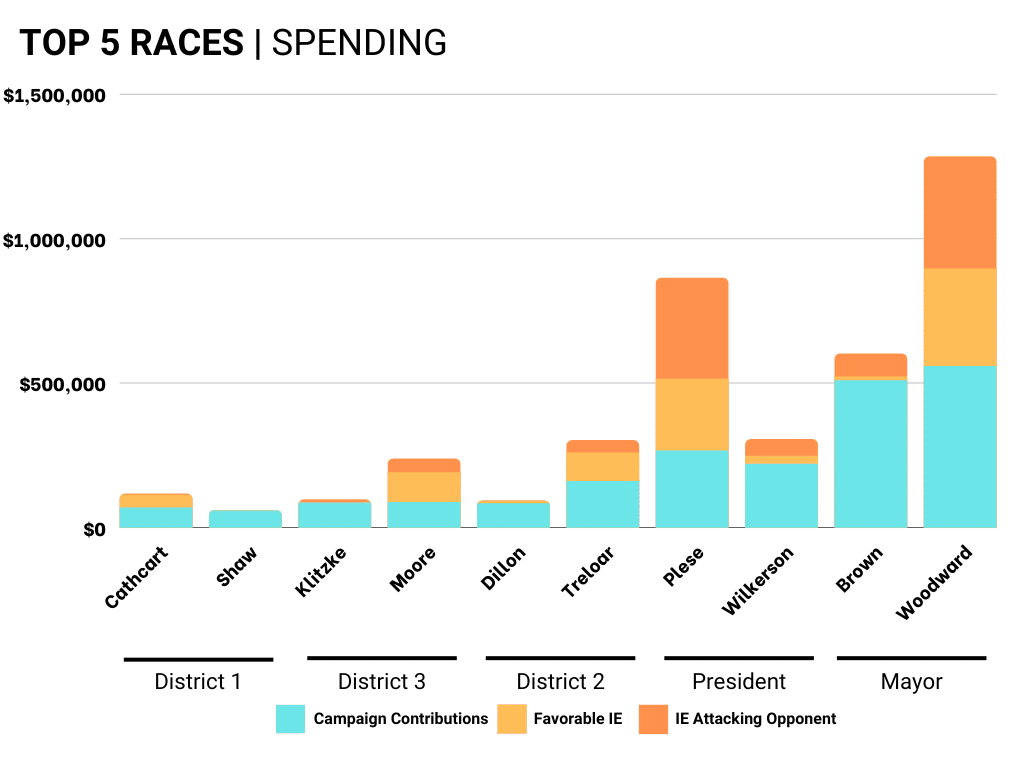 The real change is in the more than $575,000 of new spending Woodward and Plese supporters have spent attacking Brown and Wilkerson. When we zoom back out, that’s the majority of the spending story for both mayor and council president.