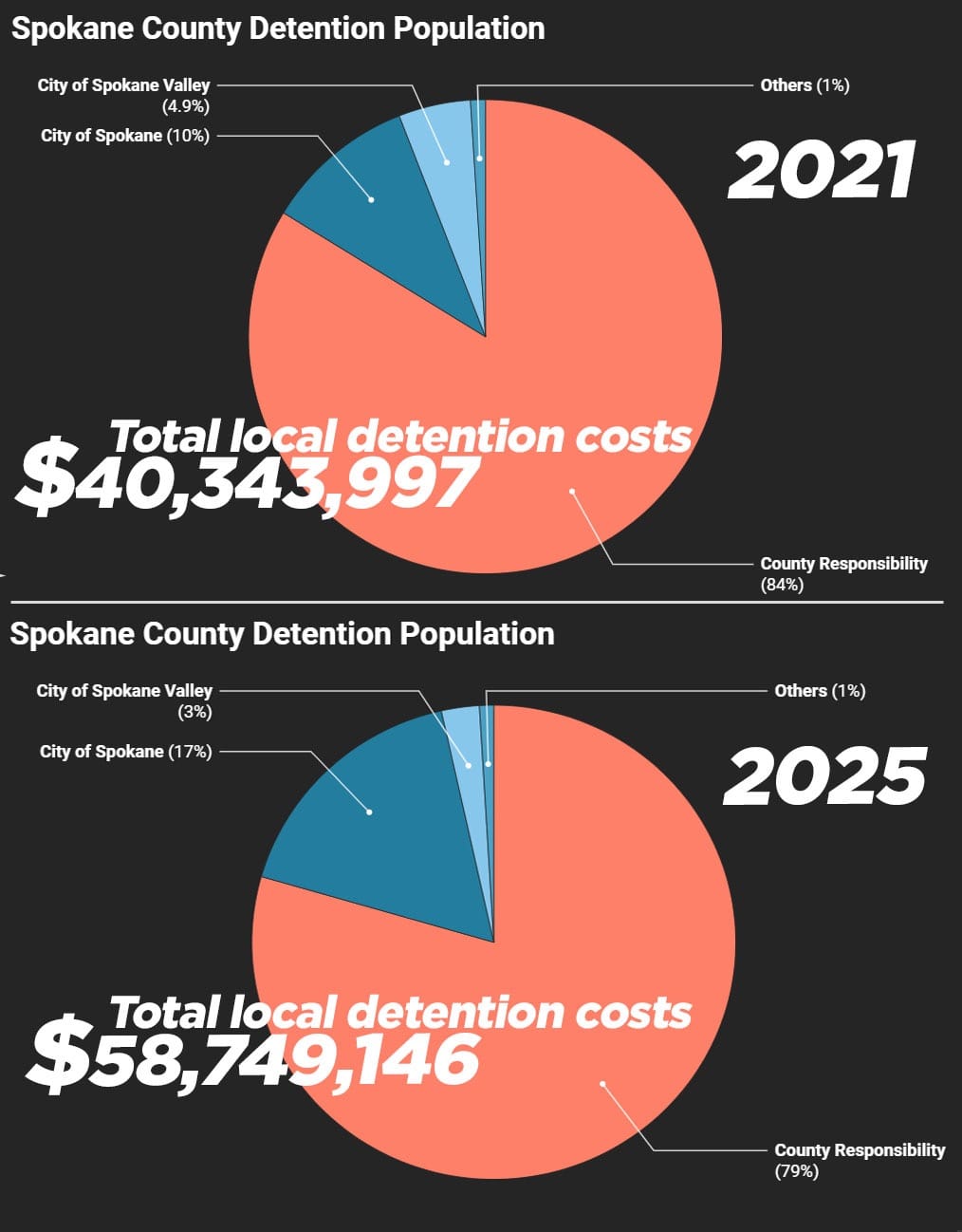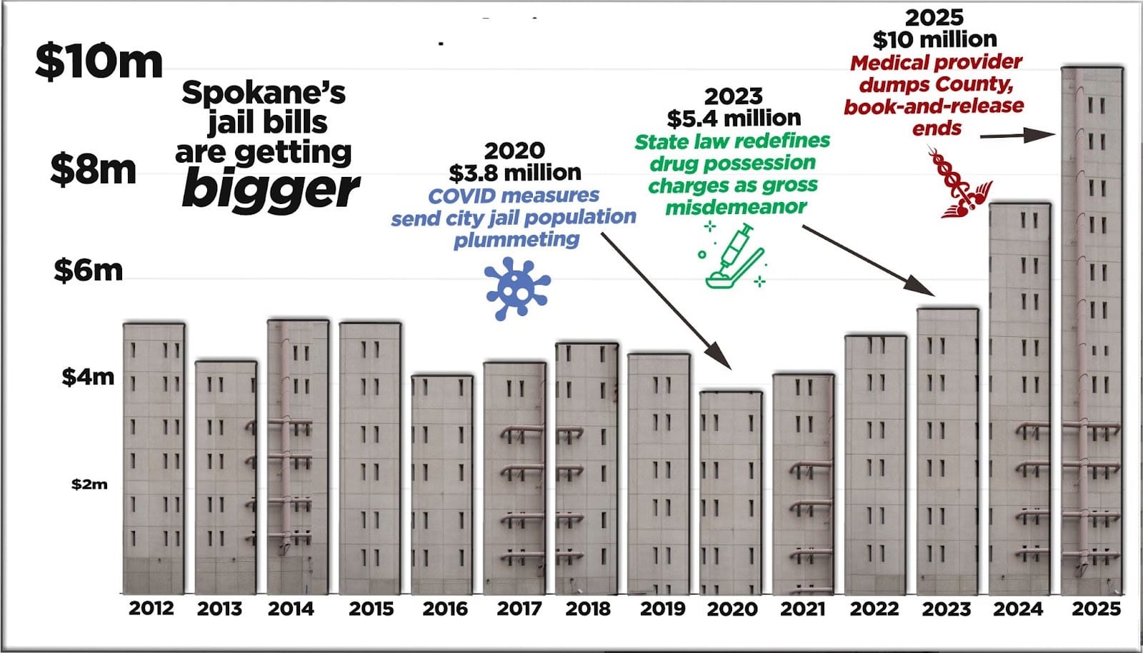 From 2021 to 2025, the overall cost of Spokane County jail services rose by 44%. It’s not hard to understand why. Inflation in the aftermath of COVID sent governments at all levels across the nation scrambling to find new revenue. When the cost of living spiked up, unions demanded higher salaries for their members.
