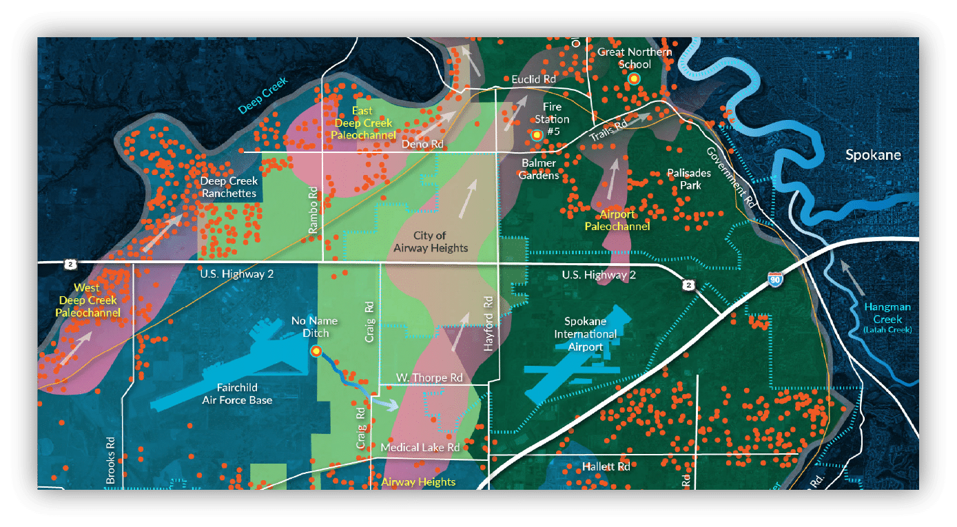 The program more than doubles the area currently served by Fairchild Air Force Base’s water provision program, extending much further north to the Spokane River and to the east, covering areas also potentially contaminated by a similar toxic spill at Spokane International Airport. In addition to the EPA’s work, Dr. Chad Pritchard, chair of EWU’s geology program, is spearheading a state-funded $450,000 study on West Plains hydrogeology that will map where PFAS are, and how they travel in the aquifers, which are slow-moving, underground bodies of water from which many communities in the area draw their drinking water. (The aquifers under the West Plains are not connected to the Rathdrum Prairie Aquifer, which provides drinking water for Spokane and much of Eastern Washington.)