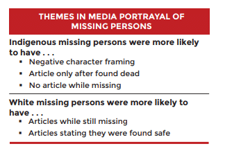 Racism, in the form of disparate media coverage, persists even if a missing Indigenous person is found murdered. According to the report,