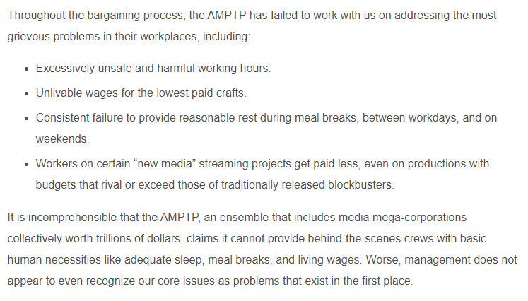 An Instagram account called ia_stories has been documenting conditions anonymously. This obviously isn’t rigorous journalism, but the individual stories are often heart-wrenching, and the stories as a whole paint a pretty damning picture of the industry and how, specifically in the case of “new media” -- technology companies are trying to “disrupt” the sector in the same way Uber and DoorDash have: by making labor as precarious as possible. With delivery services, they keep drivers contractors, not employees, and only pay for the hours they’re actively shuttling someone or delivering food. In the case of streaming platforms, it’s trying to create multiple classes of production so they can pay workers less, even when the overall budgets approach the biggest Hollywood blockbusters.